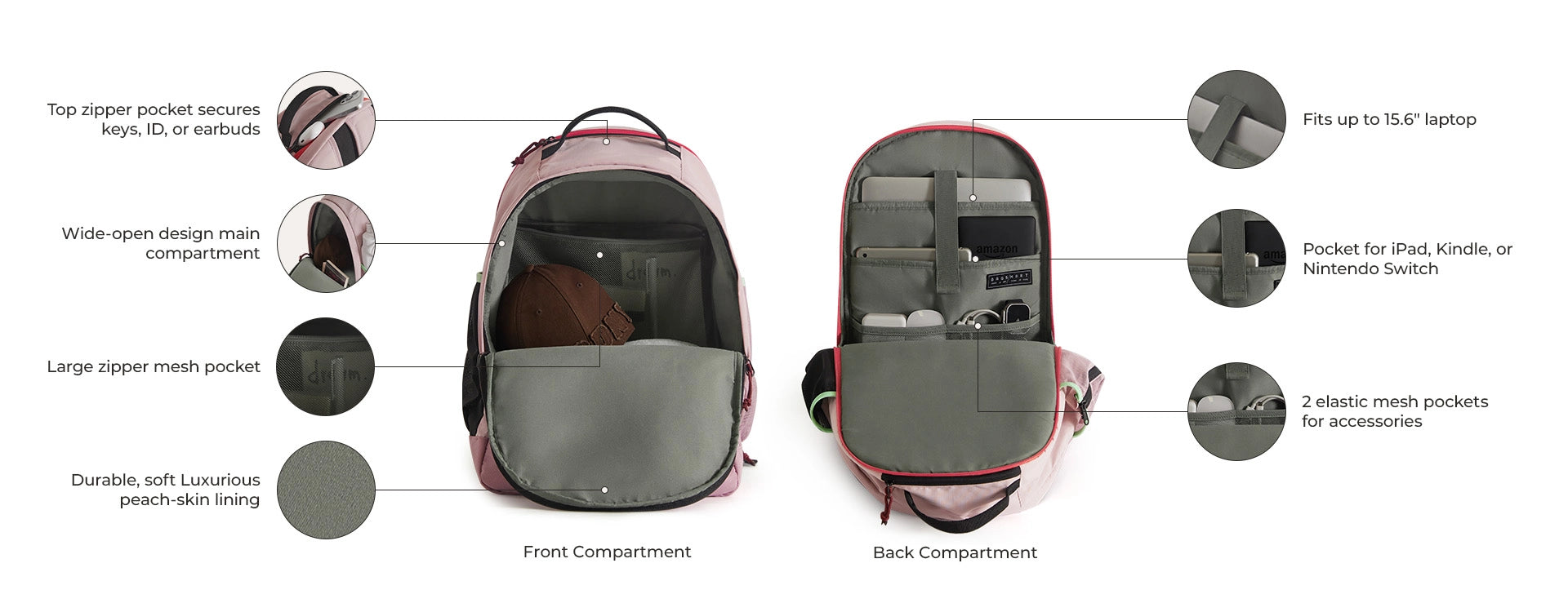 Padded 15.6" laptop compartment with an additional sleeve for your iPad, offering secure protection, plus elastic mesh pockets for organized, easy access to accessories.