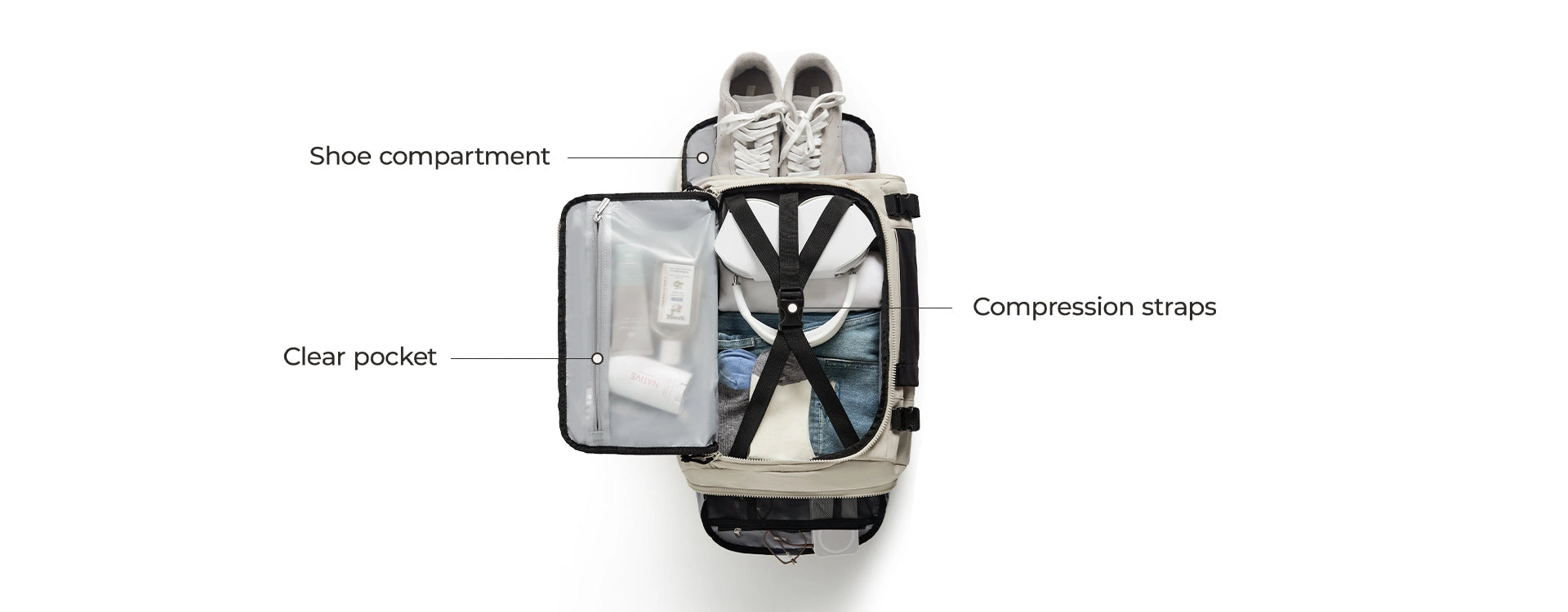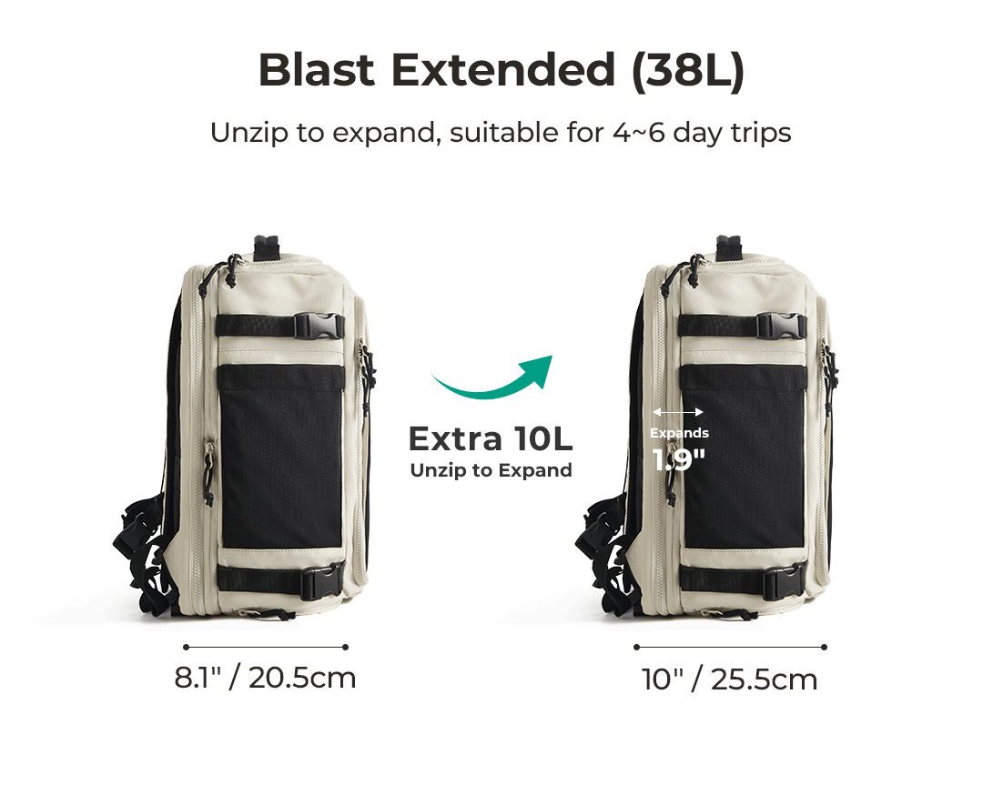 Expandable up to 38 L – extends from 28 L to 38 L for extra packing room.