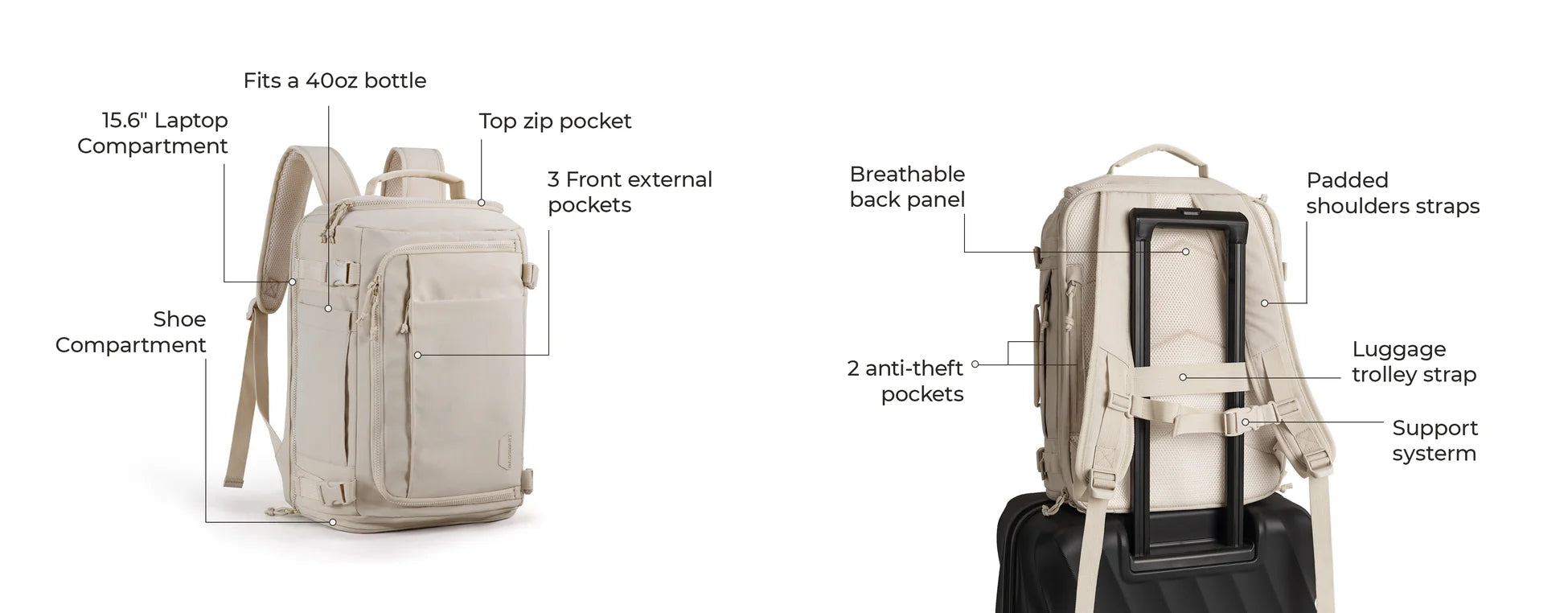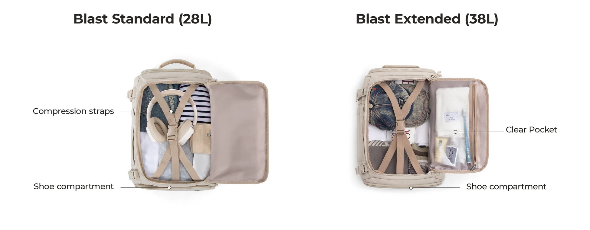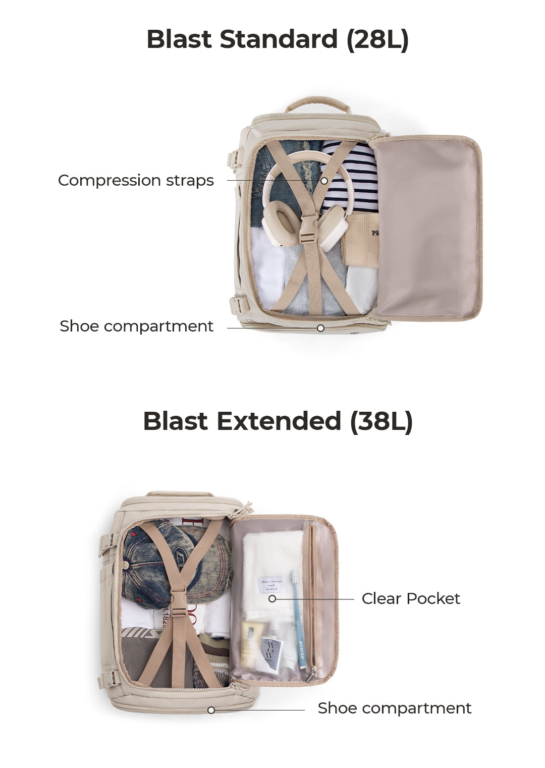 Blast Quick Access 28L–38L Carry-On Backpack – Features six quick-access pockets, a TSA-friendly 180° laptop compartment, and a ventilated shoe pocket. Lightweight, expandable, and ready for takeoff.