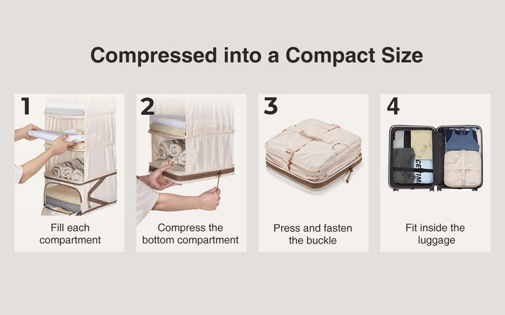 Our packing organizers boast a resilient compression buckle and zipper system, allowing them to compress into a compact size, thus optimizing space efficiency. Effortlessly slip them into your carry-on luggage to expand your wardrobe without adding bulk. Tailored to fit any carry-on size luggage, our packing cubes are versatile companions for every journey, ensuring you're always travel-ready.