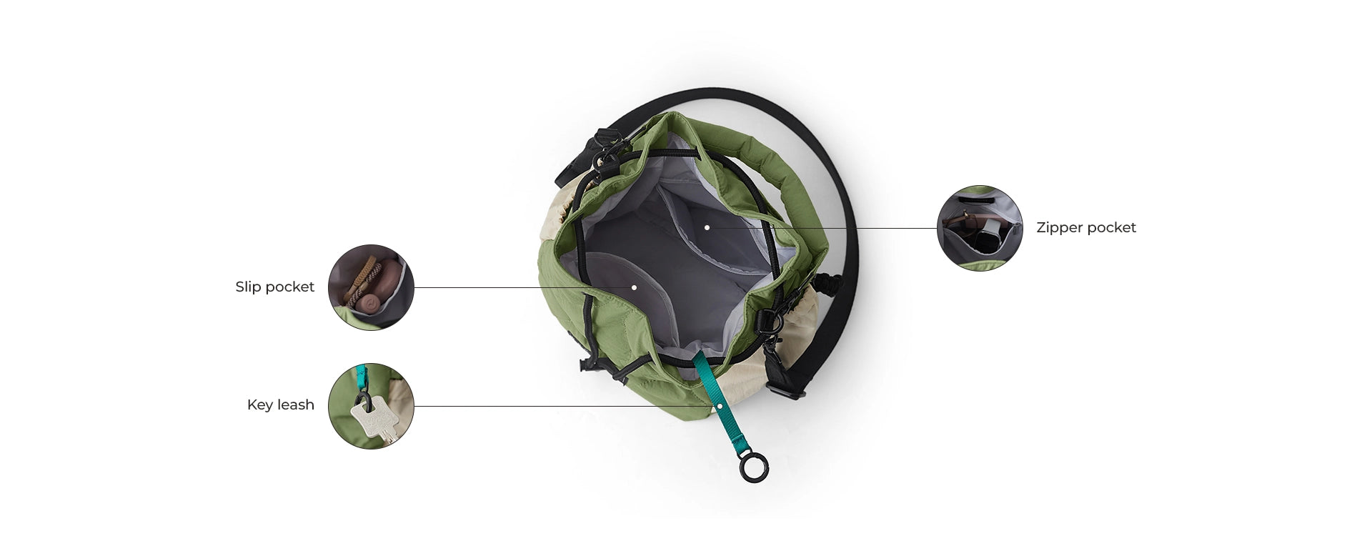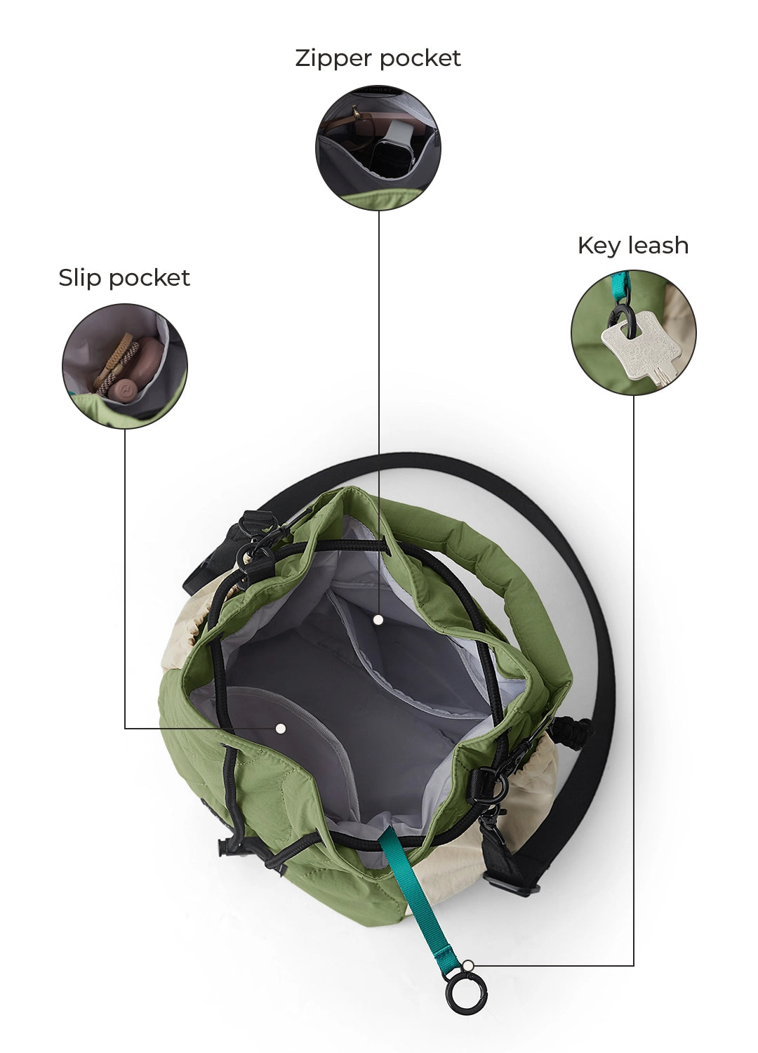 • Secure Storage: Large front zipper pocket with a key leash for phone, key, and credit cards.